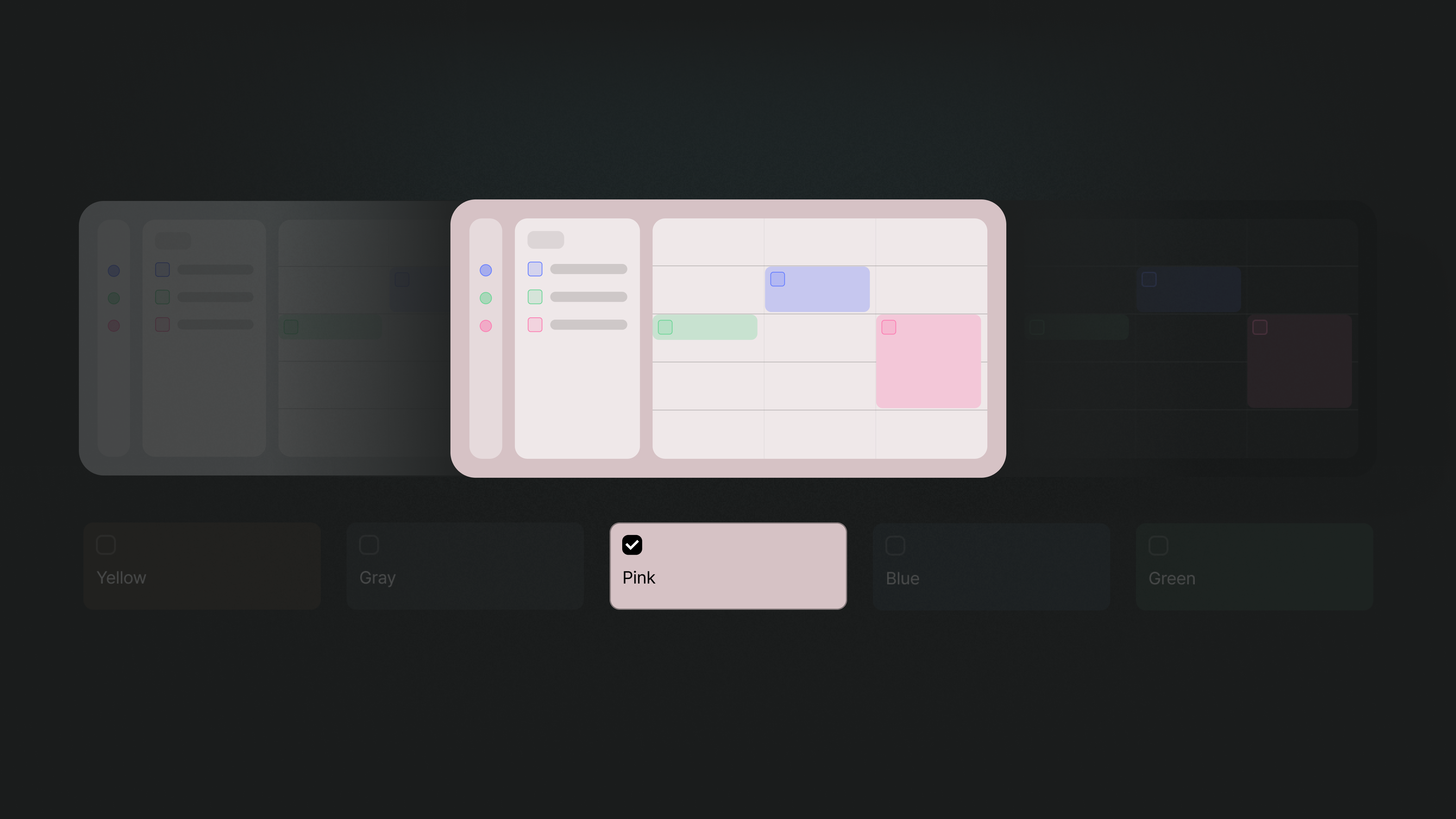 既存のダークモードに加え、ライトモードを追加しました。お好みのスタイルでアーチカレンダーをお使いいただけます。モードのほかにも、グレー、ブラウン、グリーン、ブルー、パープル、ピンクの6種類のカラーテーマから選択でき、テクスチャの透明度を調整してインターフェースの雰囲気を細かくカスタマイズすることも可能です。これらの設定はすべて設定画面の新しい表示設定タブで管理でき、リアルタイムプレビューで変更を確認しながら適用できます。